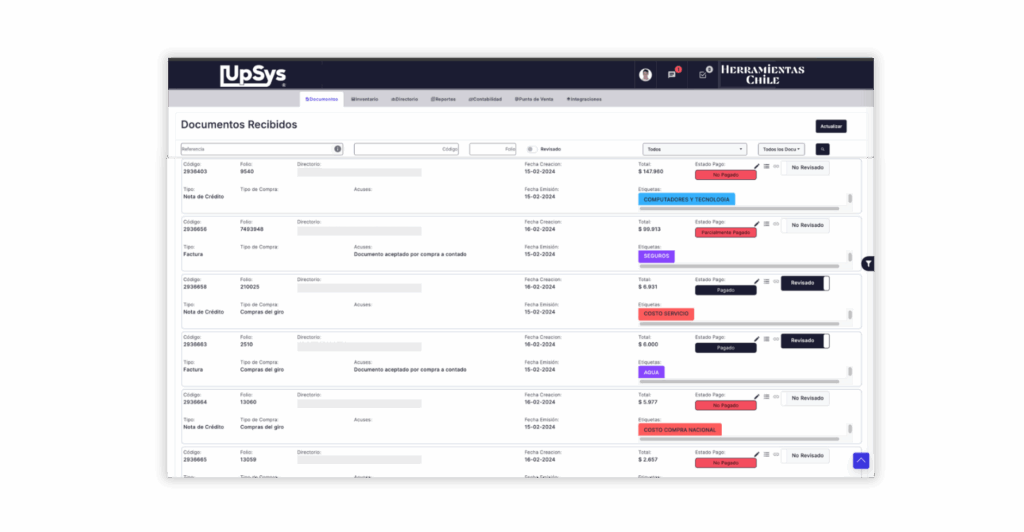 El módulo de Documentos Recibidos administra todos los documentos electrónicos obtenidos del SII.