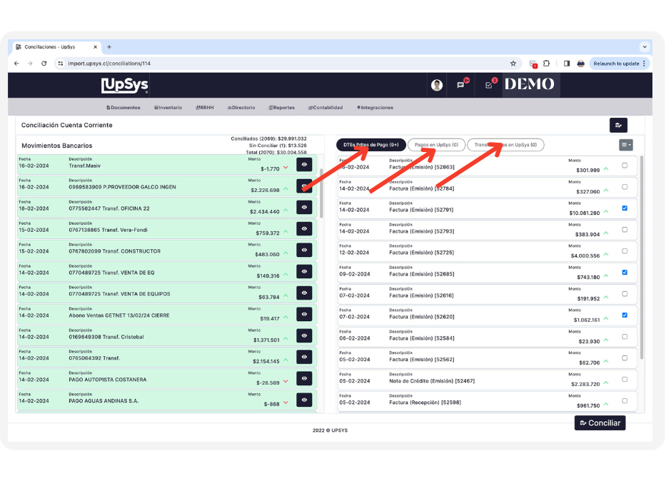 El proceso consiste en seleccionar movimientos en “fondo blancoˮ del lado derecho y relacionarlos con documentos, pagos o transferencias en las pestañas del lado izquierdo. Una vez seleccionado el movimiento al lado izquierdo, el sistema pudiese encontrar y destacar en amarillo los documentos, pagos y transferencias probables del lado derecho (con una aproximación de +/- 5).