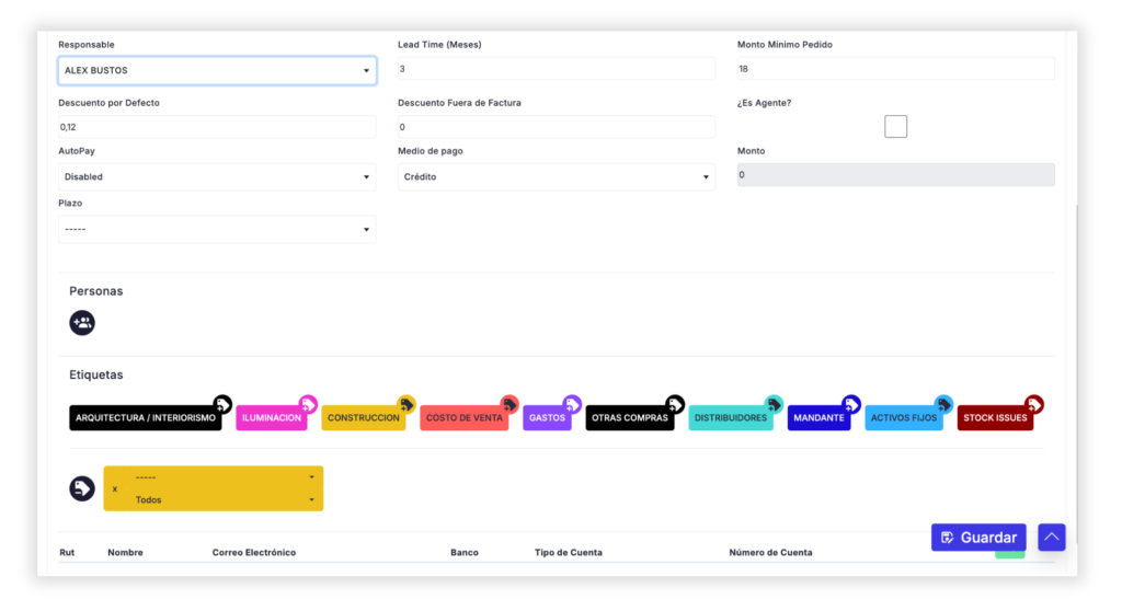 Si el RUT corresponde a un proveedor, define quién es el encargado de las compras y de la relación comercial asociada a dicho proveedor, y quien figurará como responsable para la organización de pedidos de stock.