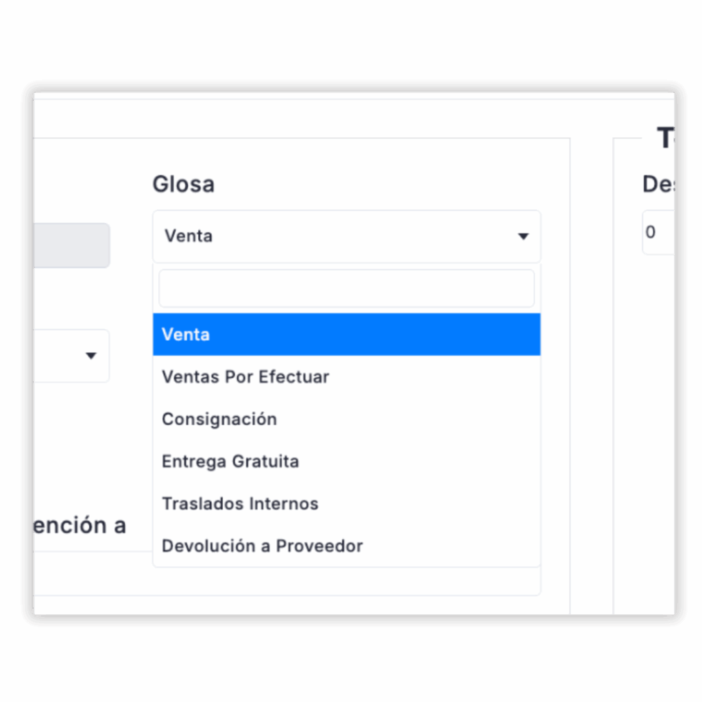 Para poder seleccionar la glosa, en la sección de información general, debemos seleccionar el campo Glosa, donde se desplegarán todas las posibles glosas para una guía de despacho: Venta, Ventas Por Efectuar, Consignación, Entrega Gratuita, Translados Internos y Devolución a Proveedor.
