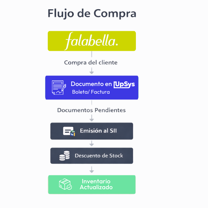Cuando un cliente realiza una compra a través de Falabella, UpSys genera automáticamente las boletas o facturas correspondientes.