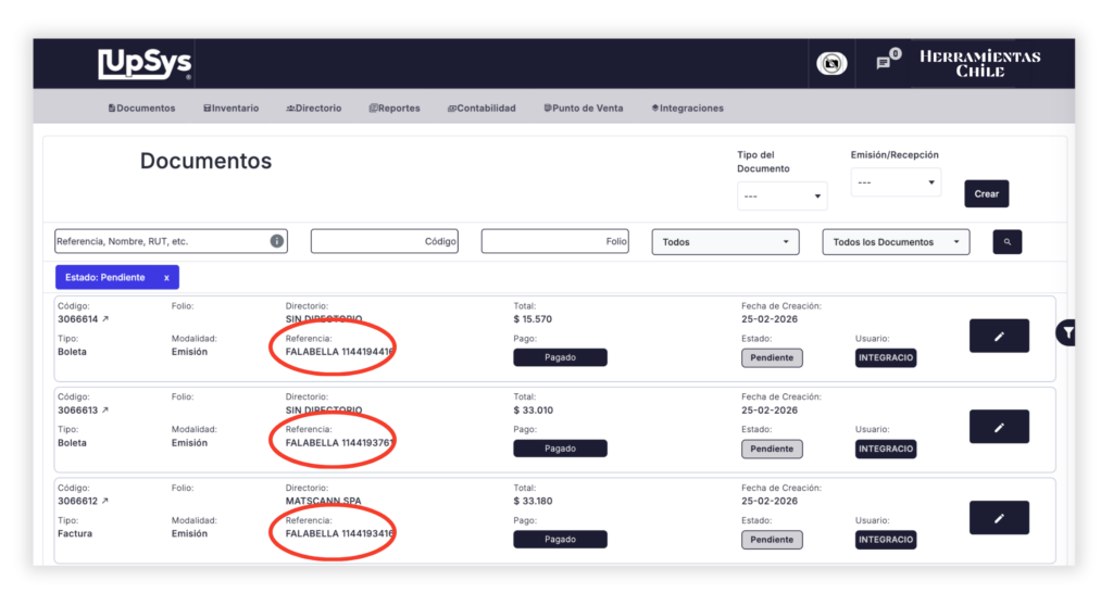 Esta opción redirige al módulo UpSys → Documentos, donde se muestran los documentos pendientes (facturas y/o boletas) correspondientes a compras realizadas a través de Falabella.
