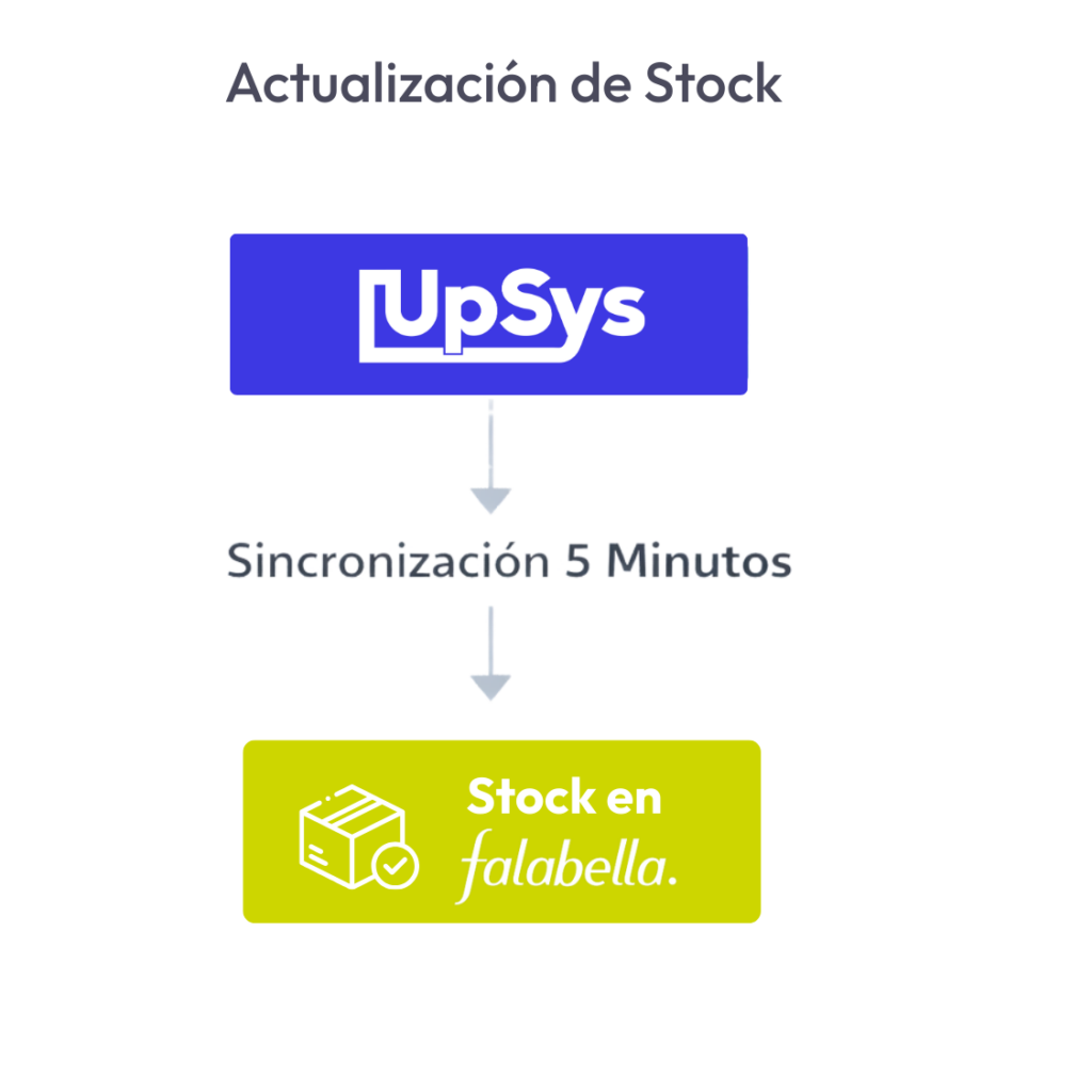 Cuando se realiza una venta desde UpSys u otro canal de venta (tienda física u online), UpSys envía las actualizaciones de stock a Falabella cada 5 minutos.