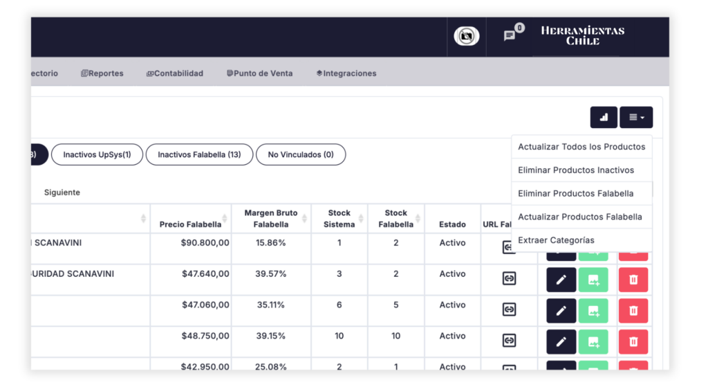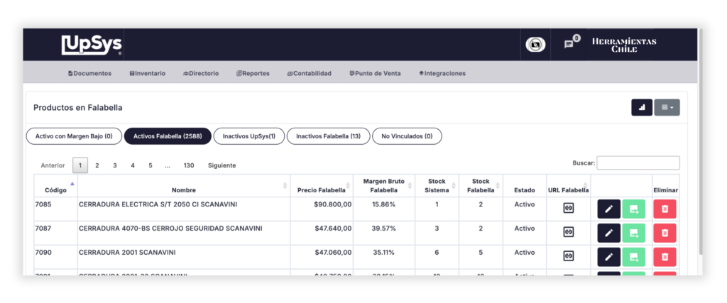 Importante: Los productos que agregues en Falabella, o cualquier cambio realizado directamente en su plataforma, se verán reflejados en la integración de UpSys al día siguiente en la mañana o manualmente (ver sección 3).