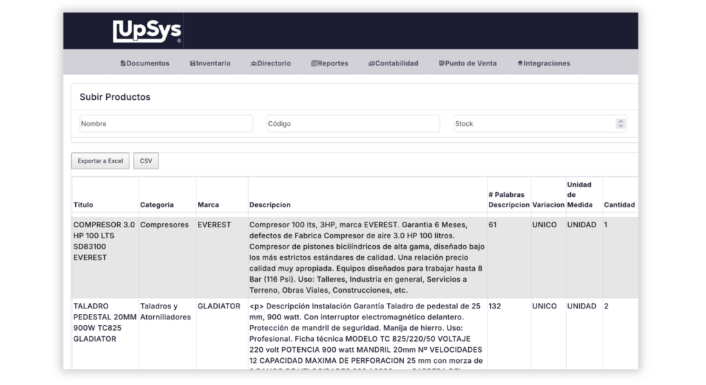 Esta opción permite visualizar los productos del inventario de UpSys que aún no están publicados en Falabella.